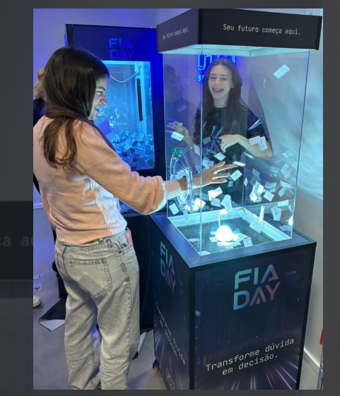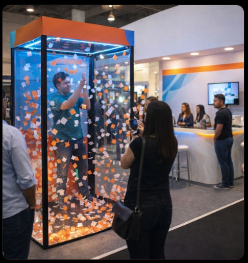 Uma cabine de vento totalmente transparente, para sorteios com vouchers (papéis) um equipamento projetado para levar o público ao delírio quando é acionada. (corpo inteiro)