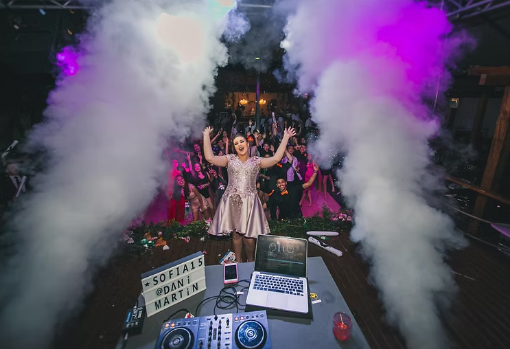 Efeito de explosão de fumaça fria que cria momentos intensos na pista de dança e apresentações.