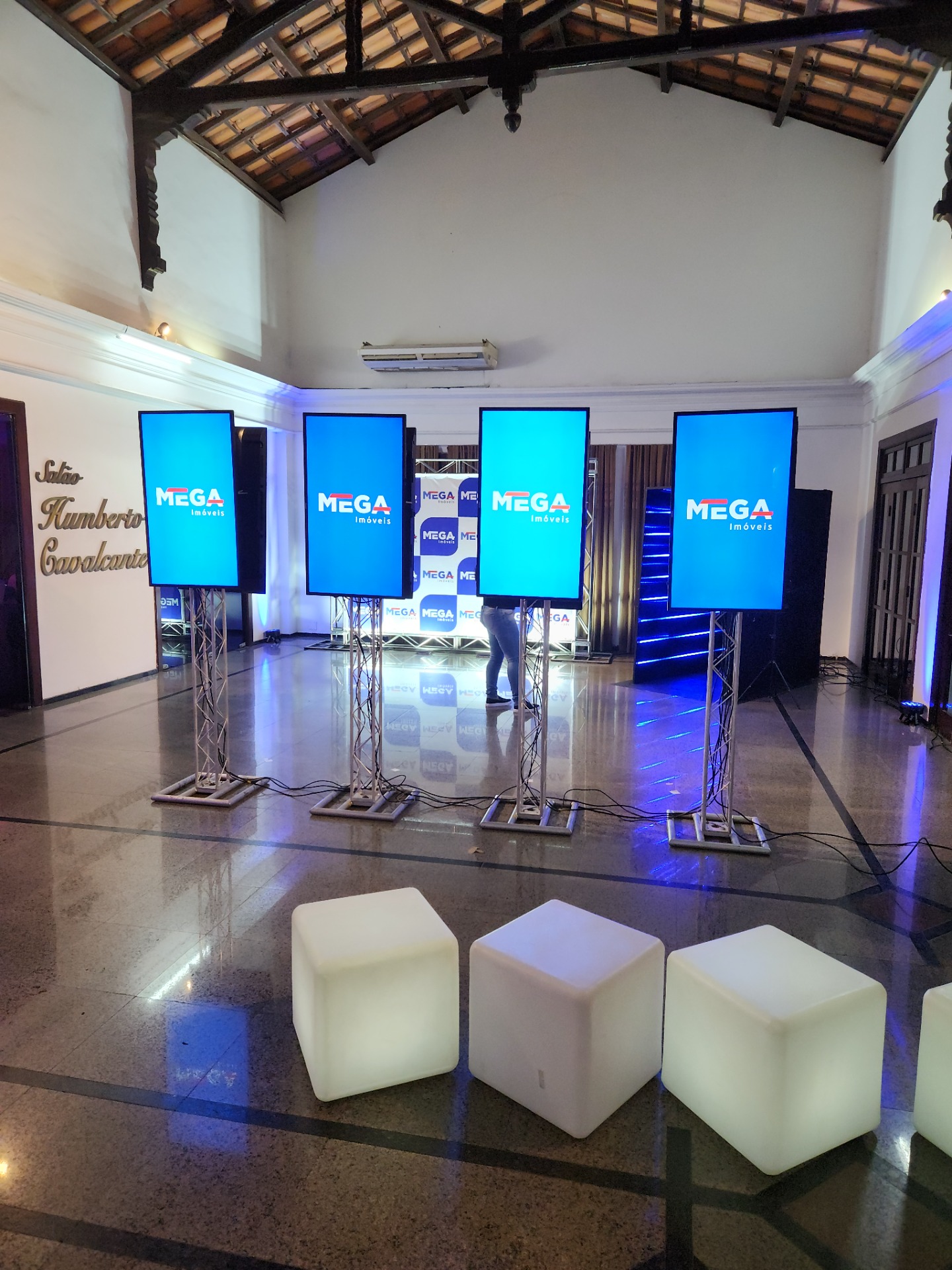 Soluções versáteis para apresentações, palestras e shows, com montagem profissional e acabamento impecável.